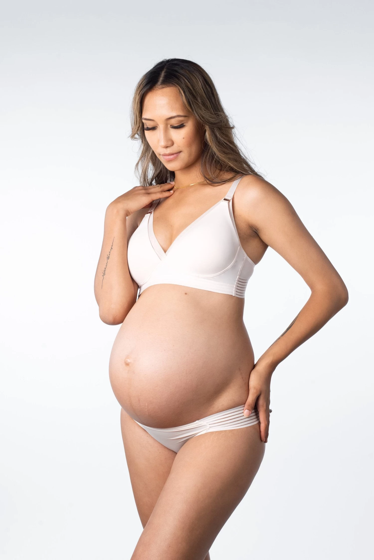 Designed to be seen, the Ambition T-shirt Bra is pure wirefree comfort, perfect for both pregnancy and breastfeeding with a mesh A-frame and a new non-roll sheer striped band elastic to soften the look of coverage. Standard or racer backstrap options and sophisticated rose gold hardware and magnetic nursing clips.