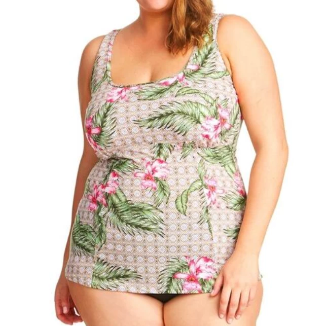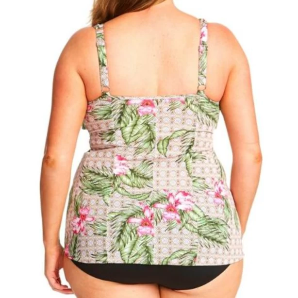 This ultra supportive Tankini Top for a larger bust is made with F and G cups in mind. The print is stunning in summer colours of tropical greens and rich fuschia pink. In plus sizes up to a 20 will fit a DD, E, F and G Cup bust too. It has a figure flattering empire line and slight A line shape. There is plenty of support and coverage in for a fuller bust with deeper cups, wider straps and high under the arms finish.