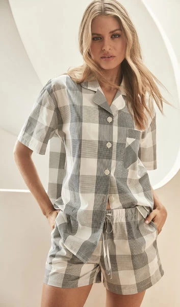Emily short set is a yarn dye check which means that the cotton is woven and not printed. This is often the case with men’s shirting. The cotton is soft and lovely to touch. The collar is curved with button through front. The fit is relaxed, and the shorts have elastic waist with waist tie.