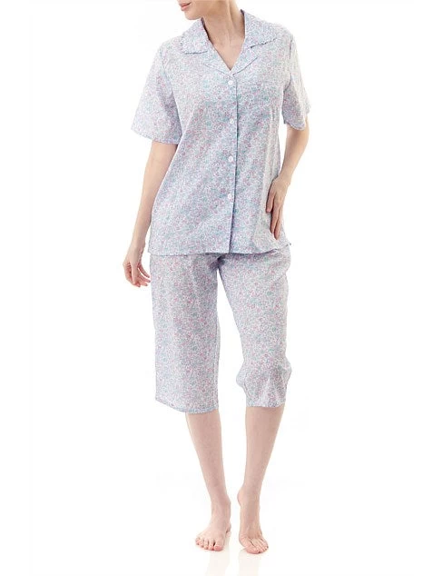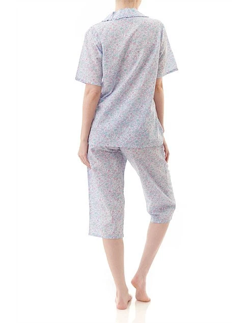 Short sleeve capri length Pyjama in a fresh blue and pink Summer print Georgia. 100% woven cotton is a light and cool choice for summer. Georgia classic style pyjama has collar, front chest pocket and, full front button opening.