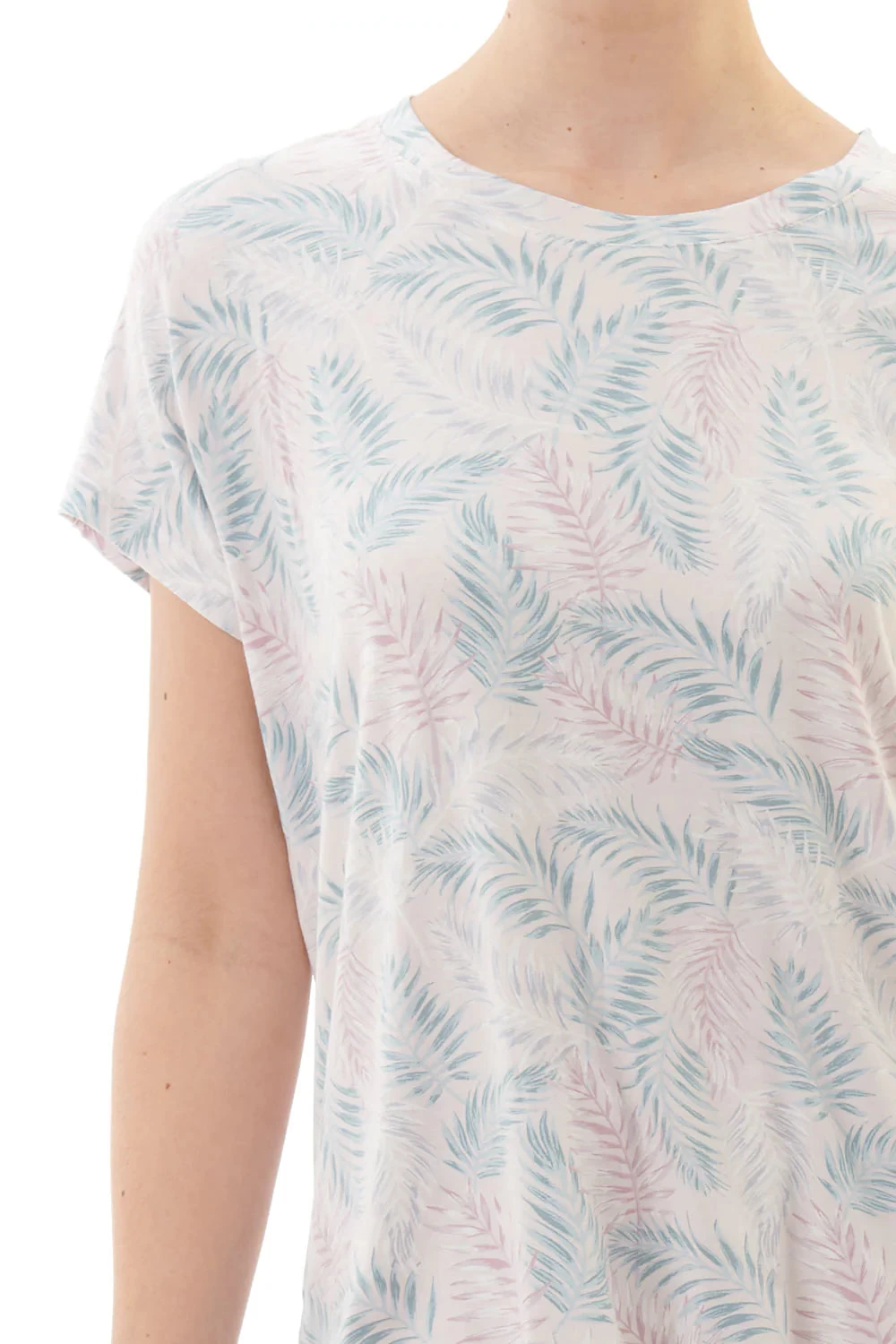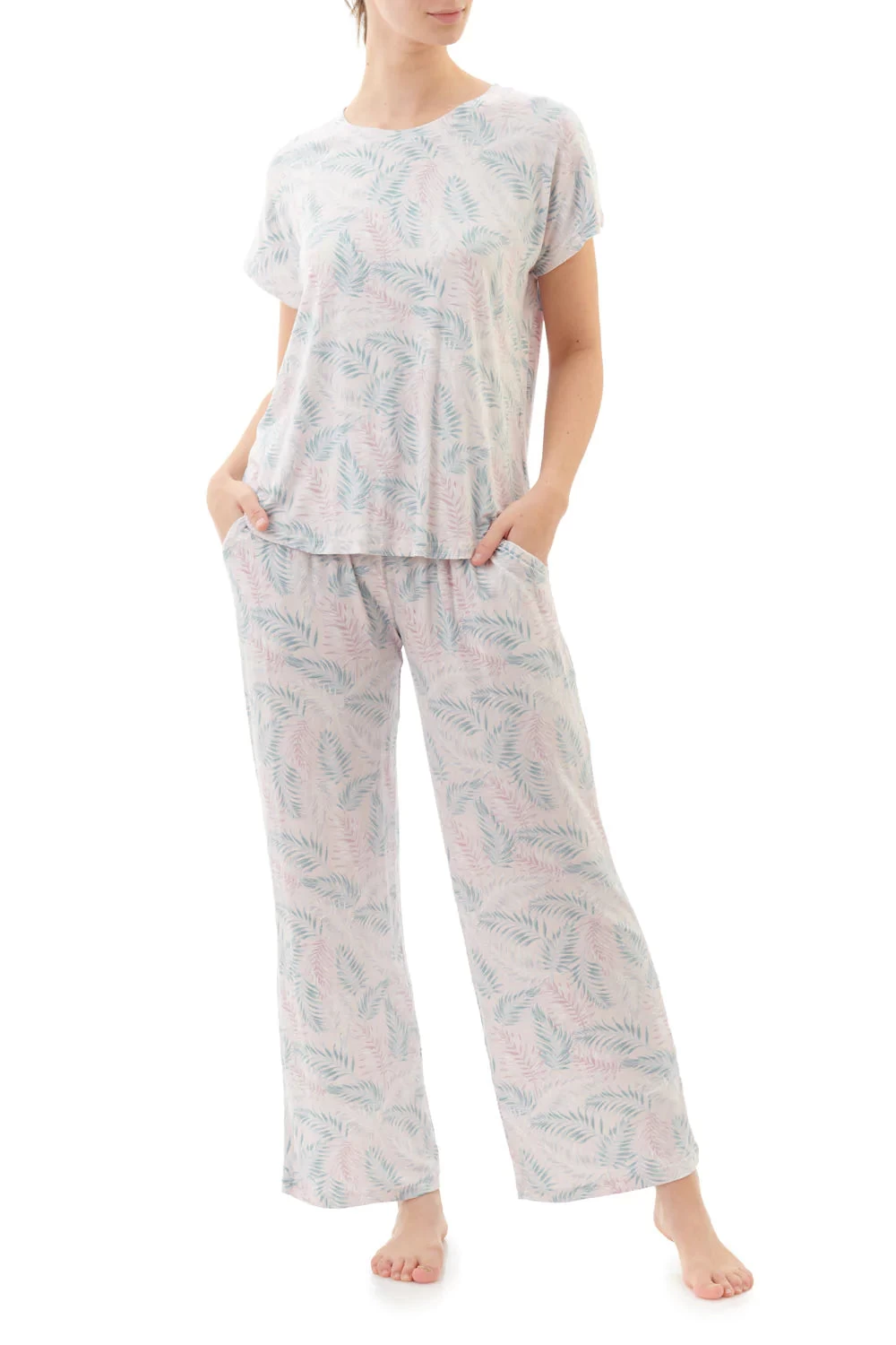 Short sleeve pyjama in the blush Fern print. This slinky knit pyjama is ideal for warm summer nights- being both cool and breathable. This pyjama has a relaxed sleeve vee neck tee . The long pants have a wide leg, comfortable waist elastic, drawstring and side pockets.