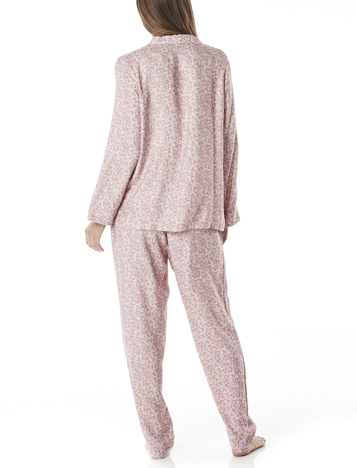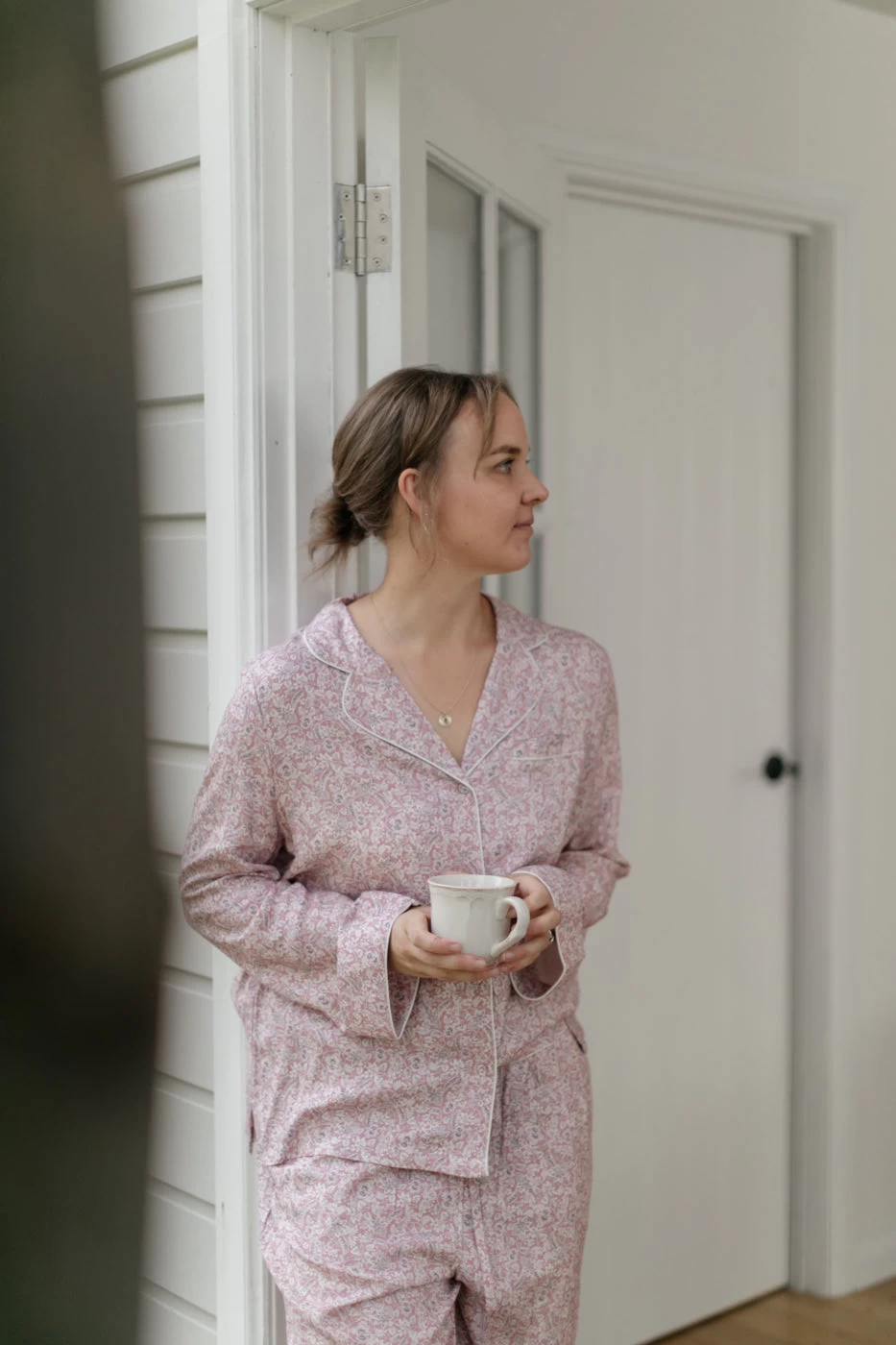 Pink smallfloral viscose pj set. viscose is a breathable natural and sustainable fabric which is silky smooth to touch. This classic button through Pj set is finished with beautiful satin edging creating a luxe detail. The front buttons are all covered fabric sew through buttons again adding to the lux. Top is acomfortable relaxed fit and pants are very relaxed and a little oversized for comfort with an elastic waist and drawstrings in self fabric.
